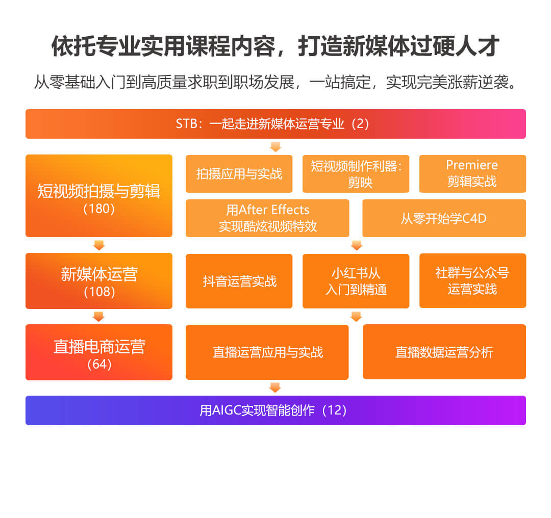 3個(gè)模塊;27個(gè)章節(jié);150+技能點(diǎn);20+新媒體營(yíng)銷方法